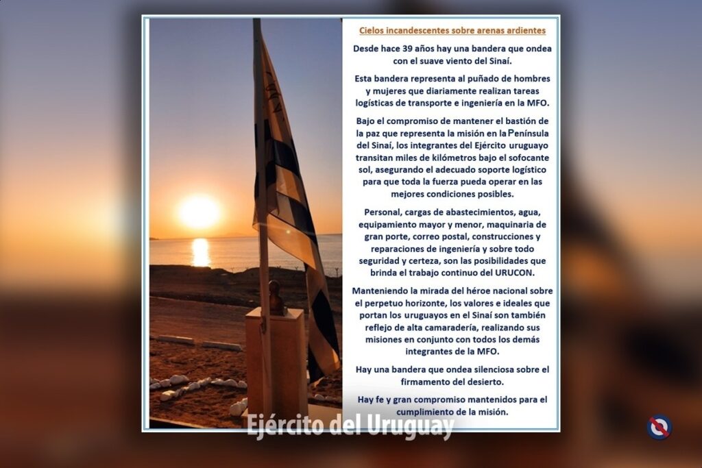 En la obra se ve nuestro Pabellón Nacional junto al busto del Prócer de la Patria, Gral. José Gervasio Artigas, flameando en un atardecer de la Península del Sinaí. Mientras que las líneas escritas, destacan la presencia del Contingente uruguayo desde hace 39 años en la MFO y la importancia de la misión asignada a nuestros compatriotas, en esta región del mundo.
