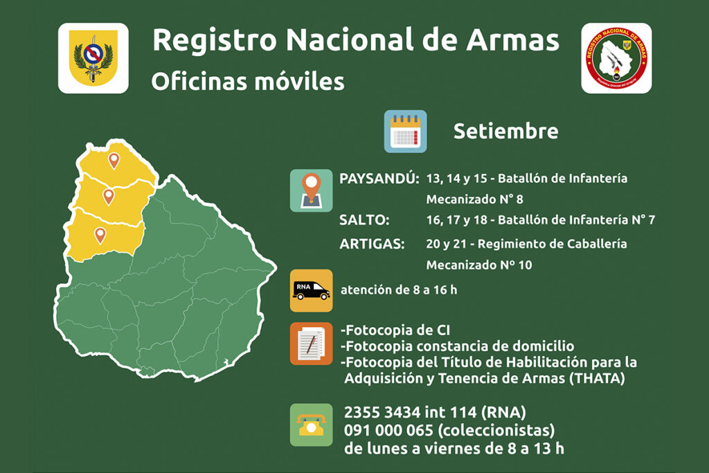 Del 13 al 21 de setiembre, el Servicio de Material y Armamento, a través del Registro Nacional de Armas (RNA), estará desplegando sus oficinas móviles en los departamentos de Paysandú (Batallón de Infantería Mecanizado Nº 8), Salto (Batallón de Infantería Nº 7) y Artigas (Regimiento de Caballería Mecanizado Nº 10).