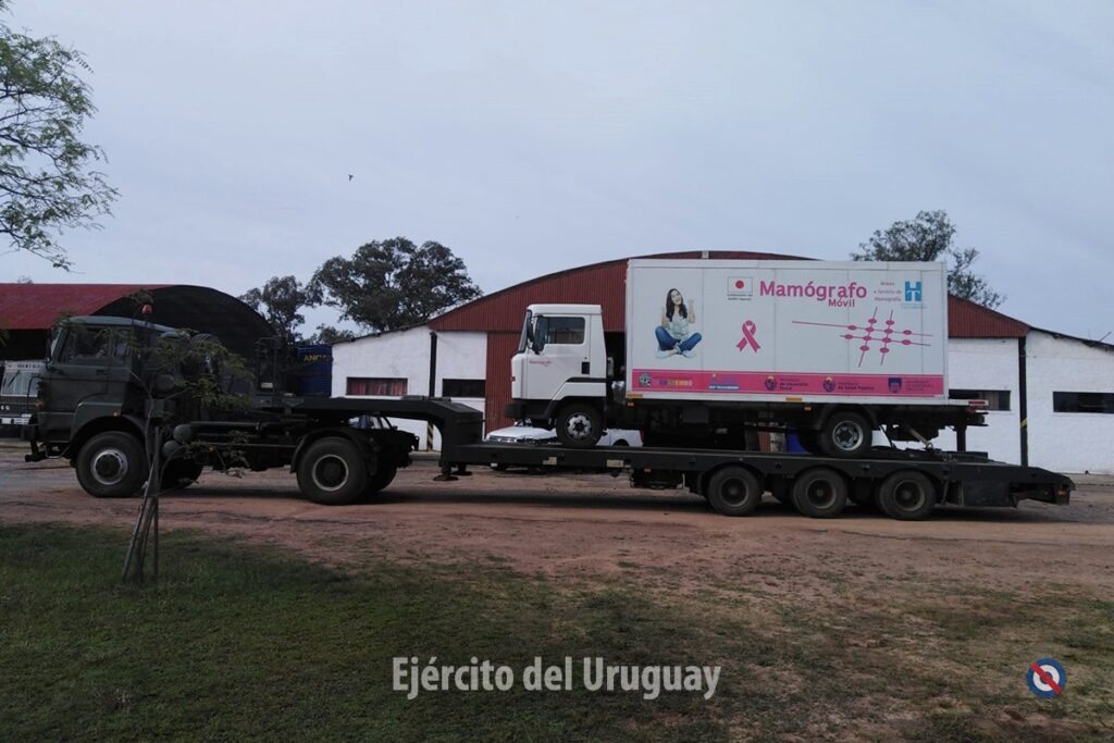Ayer, efectivos del Regimiento “Misiones” de Caballería Blindado Nº 5 en apoyo al Ministerio de Salud Pública- Uruguay, cargaron y trasladaron un mamógrafo móvil en un tractor semirremolque, desde Tacuarembó hasta la explanada del Palacio Legislativo, que será utilizado hoy de 10 a 16 h para realizar mamografías mediante agenda previa, durante la jornada de prevención contra el Cáncer de Mama.
