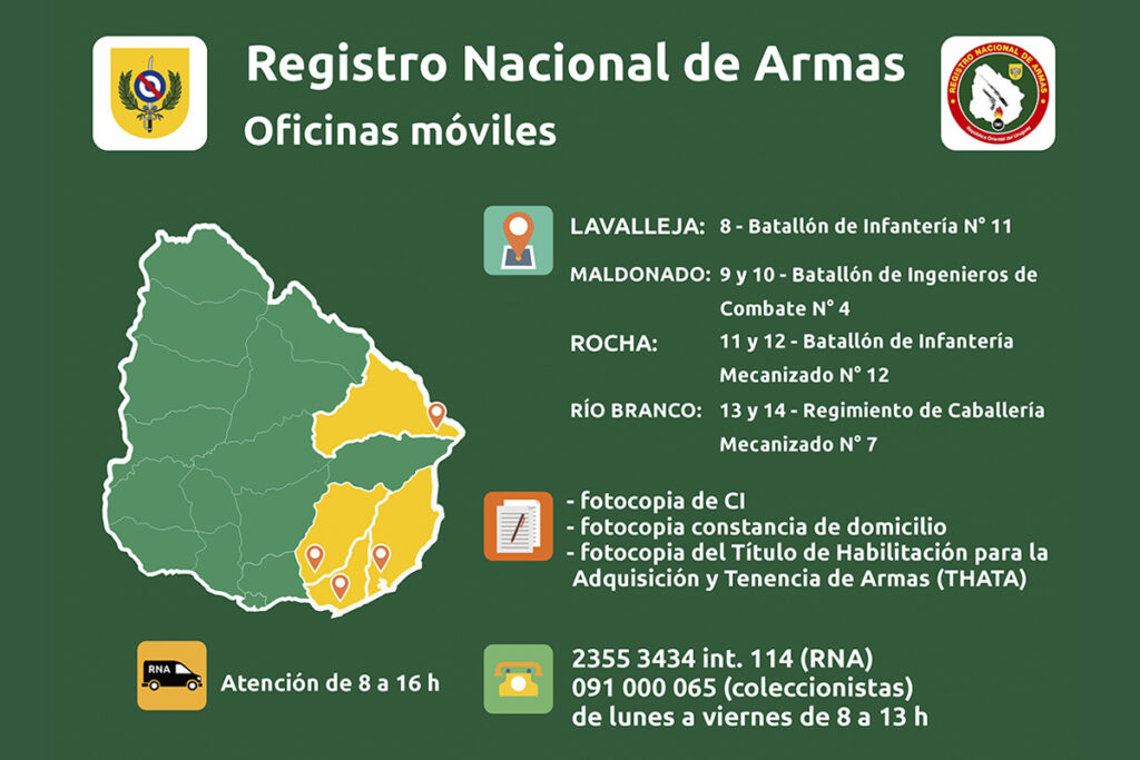 Del 8 al 14 de noviembre, el Servicio de Material y Armamento, a través del Registro Nacional de Armas (RNA), estará desplegando sus oficinas móviles en los departamentos de Lavalleja (Batallón de Infantería Nº 11), Maldonado (Batallón de Ingenieros de Combate Nº 4), Rocha (Batallón de Infantería Mecanizado Nº 12) y Río Branco (Regimiento de Caballería Mecanizado Nº 7).