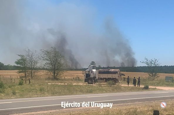 En la tarde, una Sección de Apoyo a Emergencias del Batallón «Resistencia» de Infantería Mecanizado N° 2, se encontraba desplegada trabajando con medios en apoyo a otras instituciones, en el km 35 de la Ruta Interbalnearia, en el incendio de El Fortín de Santa Rosa, para evitar la propagación del fuego y controlarlo.