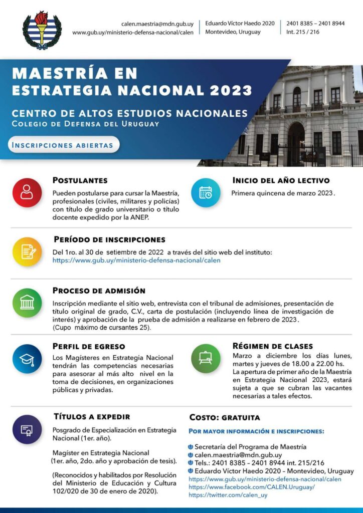 1- Inscripción del 1 al 30 de septiembre de 2022, completando el formulario electrónico al cual se accede desde la página web del CALEN: https://www.gub.uy/ministeriodefensa…/calen/inscripciones