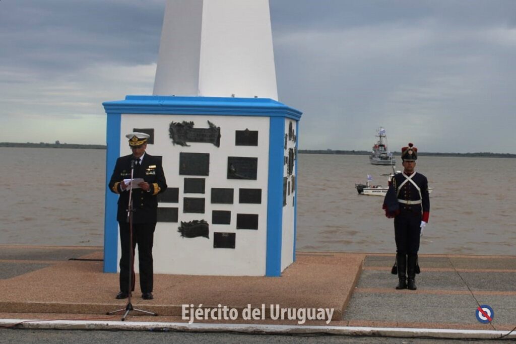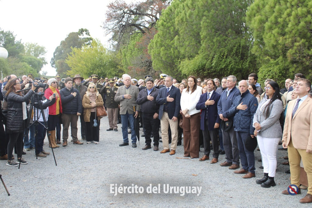 En primera instancia, se entonó el Himno Nacional. Las autoridades presentes colocaron ofrendas florales al pie de la pirámide que recuerda la Cruzada Libertadora de 1825.
