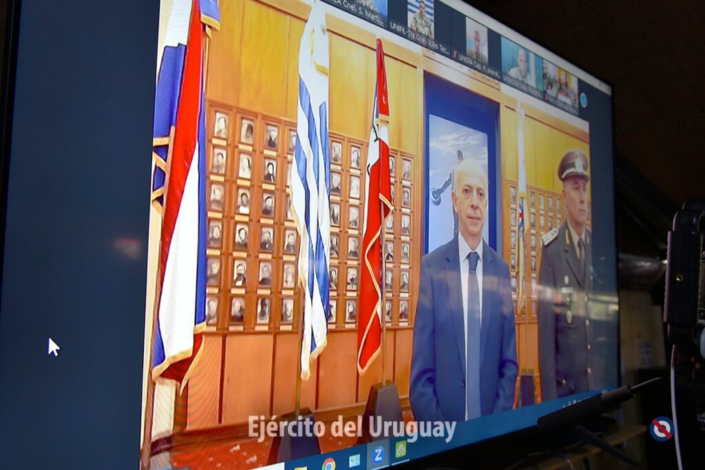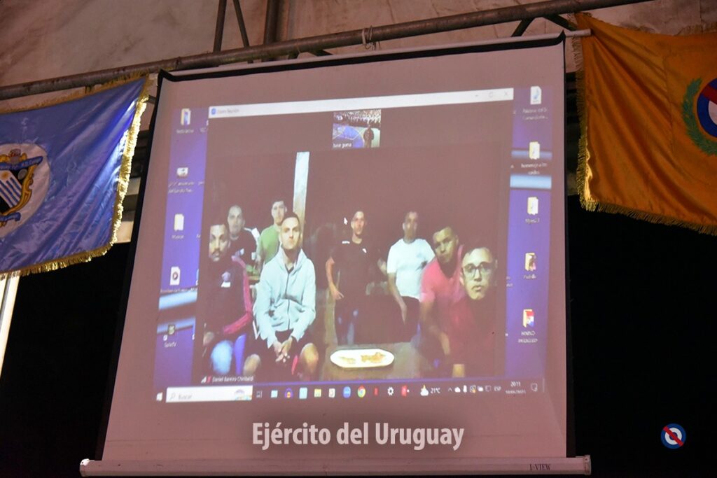 Posteriormente, todo el Batallón formado en el gimnasio, recibió por Zoom, el saludo del Sr. Ministro de Defensa Nacional, Dr. Javier García y del Sr. Comandante en Jefe del Ejército, Gral. de Ejército Mario Stevenazzi.
