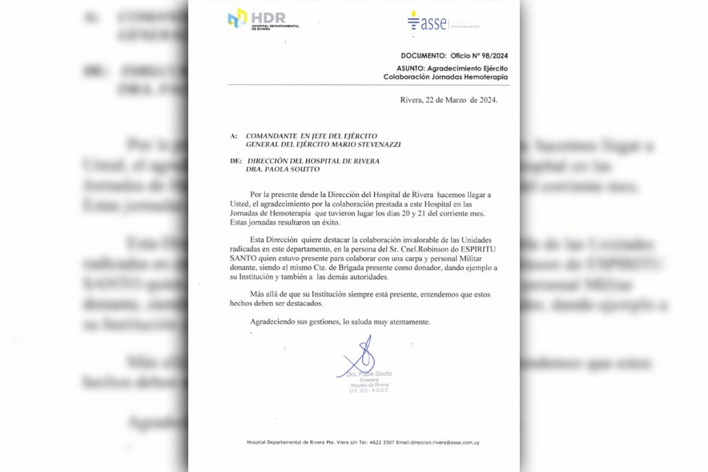 Compartimos una nota de agradecimiento emitida por la Dirección del Hospital de Rivera, ante el trabajo realizado por efectivos militares de dicha ciudad, durante las Jornadas de Hemoterapia del 20 y 21 de marzo (Brigada de Caballería N° 1 y Regimiento de Caballería Mec. N° 3).