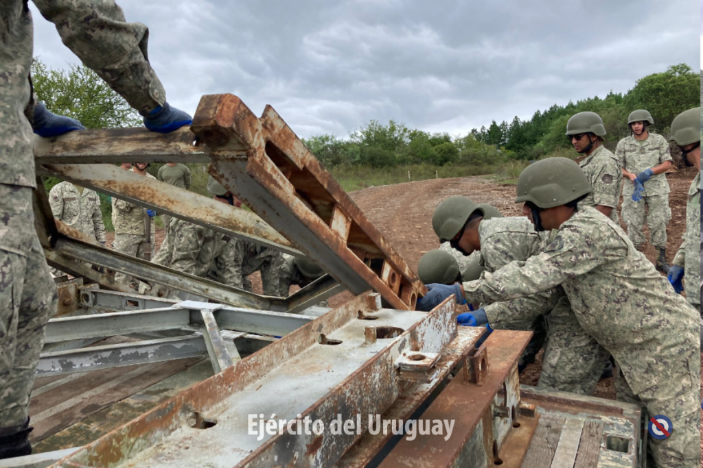 En el día de hoy, efectivos del Batallón «Charrúa» de Ingenieros de Combate N 3 realizaron la descarga del material, finalizaron la nivelación de los rodillos fijos y oscilantes que portan el puente al momento del lanzamiento y comenzaron a armar los primeros tramos.