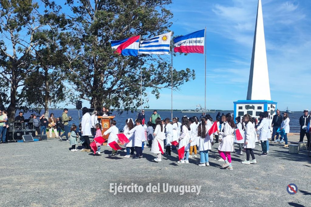 En primera instancia, se entonó el Himno Nacional. Las autoridades presentes colocaron ofrendas florales al pie de la pirámide que recuerda la Cruzada Libertadora de 1825.