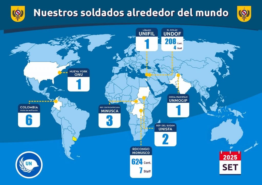 El Ejército Nacional saluda a todos sus hombres y mujeres que han servido y a los aprox. 900 Cascos Azules que hoy contribuyen a forjar la Paz, desplegados en diversas partes del mundo bajo el mandato de Naciones Unidas en: República Democrática del Congo, República Árabe de Siria, República de Colombia, República Centroafricana, India – Pakistán, República de Sudán, Nueva York y República Libanesa; en procura de garantizar la seguridad y avanzar hacia un futuro prometedor.