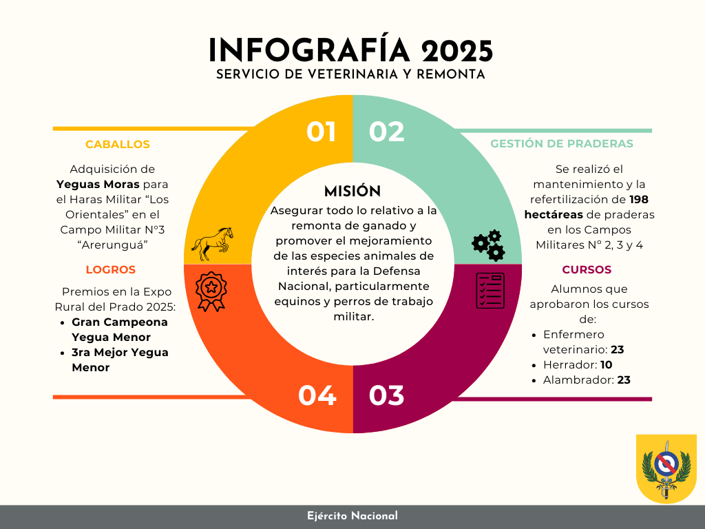 Asimismo, se adquirió nueva genética para la cabaña de ganado Hereford del Campo Militar Nº3 «Arerunguá», fundamental para la obtención de animales más productivos, eficientes y adaptados a las exigencias del mercado. Otro hito relevante fue la adquisición de yeguas moras para el Haras Militar «Los Orientales», ubicado en el mismo campo. En paralelo, se ejecutó el Plan Sanitario correspondiente a todo el ganado bovino, ovino y equino de los Campos Militares dependientes del Servicio.