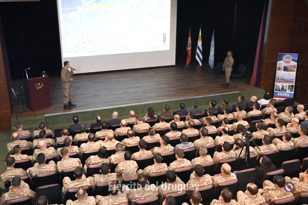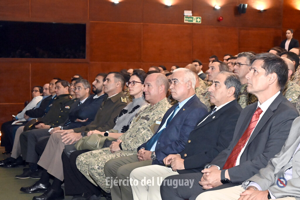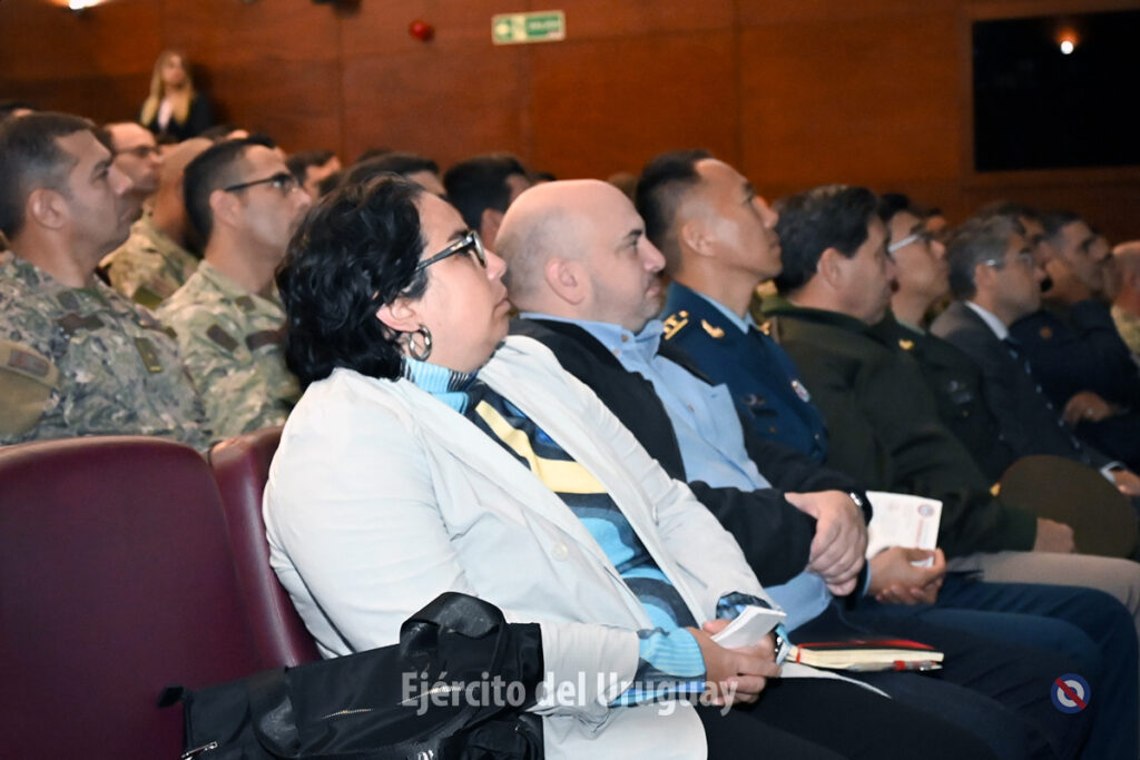 Estaban presentes en el auditorio, autoridades del Ministerio de Defensa Nacional: la Directora General de Política de Defensa, Lic. Nadia Almeida; la Directora de Asuntos Internacionales, Lic. Nastasia Barceló, y el Director de Formación Militar, Mag. Diego D’Elía, el Director General del Sistema Nacional de Apoyo a las Operaciones de Mantenimiento de la Paz, Gral. Tabaré Cardozo, Agregados Militares, el Director General del IMES, Oficiales Superiores en situación de retiro, personal militar de Ejécito y Armada Nacional, entre otros.
