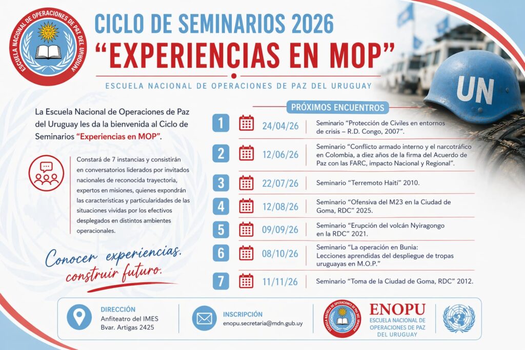 Estas actividades son organizadas por la Escuela Nacional de Operaciones de Paz del Uruguay y tienen como finalidad compartir experiencias y lecciones aprendidas en Misiones Operativas de Paz. En su totalidad, constará de siete instancias, que se desarrollarán en modalidad presencial y virtual, incluyendo conversatorios a cargo de invitados nacionales de reconocida trayectoria, especialistas en misiones y protagonistas directos, quienes expondrán sobre experiencias en diversos escenarios operacionales.