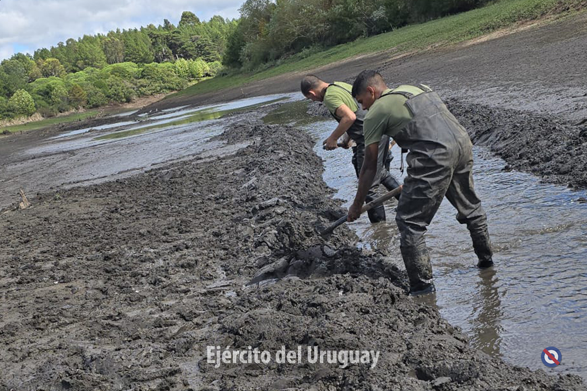 13.02.2023 – El Ejército Nacional, se encuentra realizando tareas de mantenimiento de tajamares y aguadas en Sauce (Canelones), en el marco del apoyo a la comunidad en el déficit hídrico.